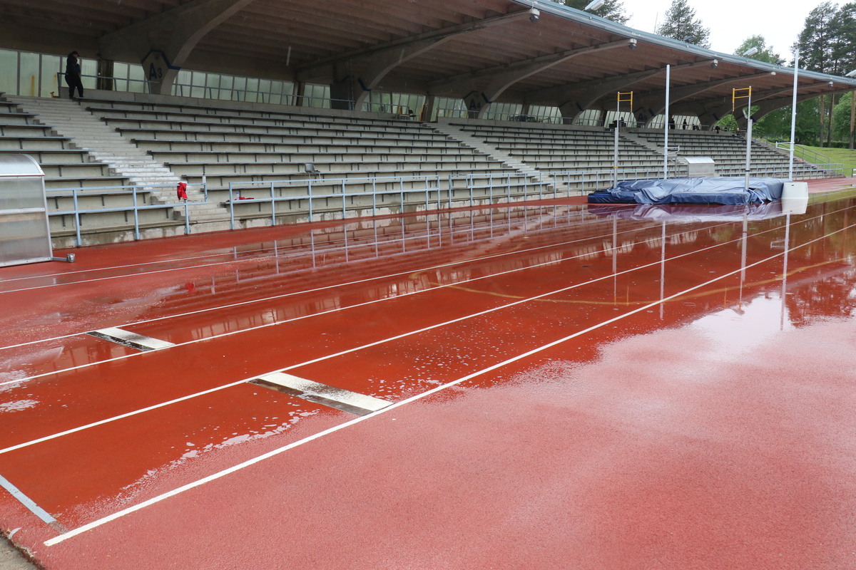 Kipinä järjesti hyppyjen lajipäivän 9.6. Päivän sää oli sateinen ja kolea. Ennen kilpailujen alkua sade kuitenkin lakkasi. Korkeushyppy onnistui kylmässäkin suhteelisen kuivalla hyppypaikalla, vaikka patjat olivat märät. Sen sijaan seivästä, pituutta ja 3-loikkaa ei kukaan rohjennut hypätä. Kuten kuvista näkyy, hyppypaikat olivat veden peitossa. |